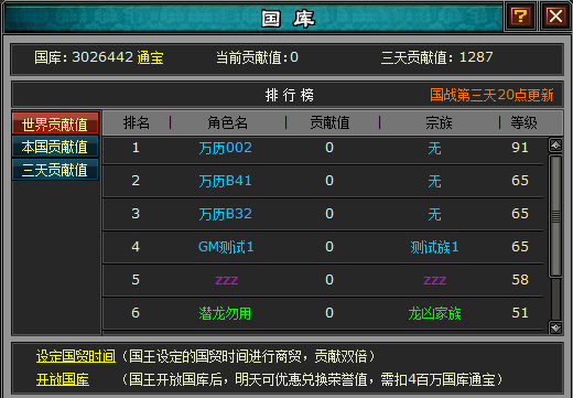 查看国库的同时还可以查看贡献值排行榜。贡献值排行榜分为世界贡献榜、本国贡献榜以及三天贡献榜。