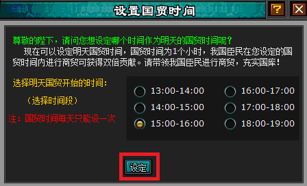 国贸时间只能设定在系统给定的时间段内,国王可与国民商量后再设定国贸时间。