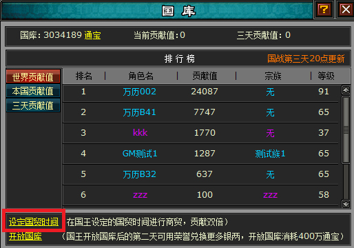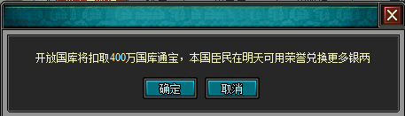 国王进入国库即可选择“开放国库”。开放国库需扣取400万库存的通宝,开放国库后的第二天,本国国民可用荣誉值兑换更多银两!