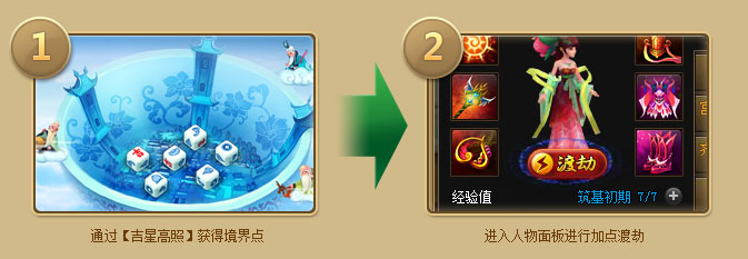 【渡劫】境界分为:炼气期、筑基期、结丹期、元婴期、化神期、炼虚期、合体期、大乘期、仙人期。每一个境界都分初期、中期、后期。玩家可以通过【吉星高照】获得境界点来提升自身的境界,达到一定境界后可开始参加渡劫之战。在渡劫战斗中,渡劫者可选择一个伙伴或主角一起参战,渡劫成功就可以获得一定的生命值奖励。
