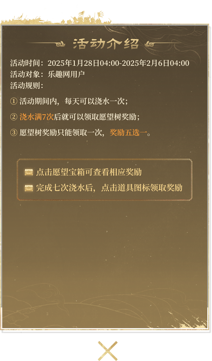 1.活动期间内,每天可以浇水一次,浇水满7次后就可以领取愿望树奖励