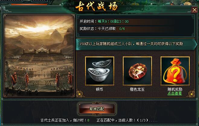 2.古代战场开启时间为每天9:00-23:00,游戏界面抢先看: