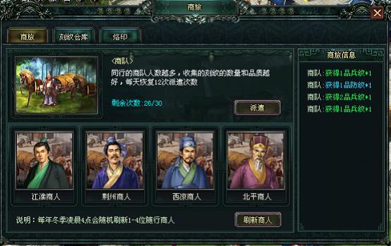 随机商人: 每年最少会随机遇到四支商队的其中1支,甚至遇到2、3支都是正常的,但一般不可能同时4名商人。 刷新商人: 如果太守大人不满意当前的商队,可想办法刷新商人试试运气。 一旦找到,商人就会为玩家服务一年。(游戏时间一年,真实时间四天)