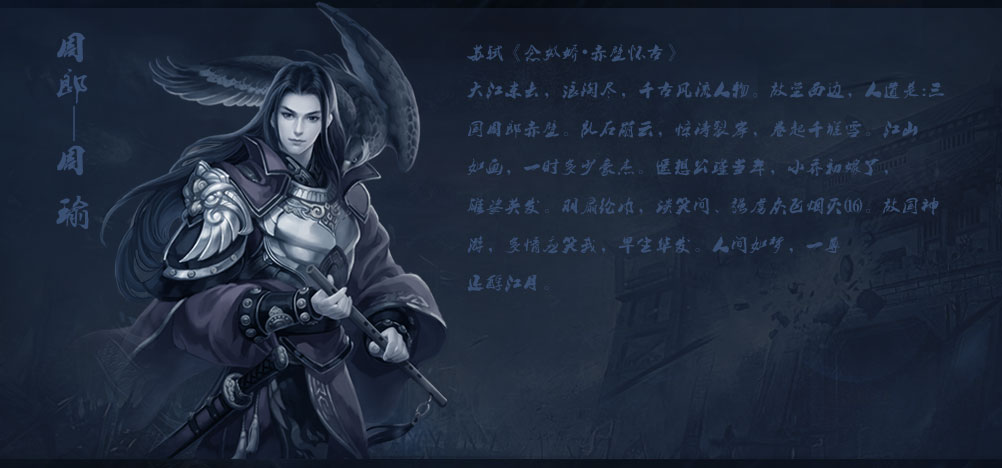 周瑜少与孙策交好,21岁起随孙策奔赴战场平定江东,后孙策遇刺身亡,孙权继任,周瑜将兵赴丧,以中护军的身份与长史张昭共掌众事。建安十三年(208),周瑜率江东孙氏集团军队与刘备军队联合,赤壁之战大败曹军,由此奠定了三分天下的基础。建安十四年(209)领南郡太守。建安十五年(210)病逝,年仅36岁。上周瑜“性度恢廓”“实奇才也”,范成大誉之为“江左风流美丈夫”。