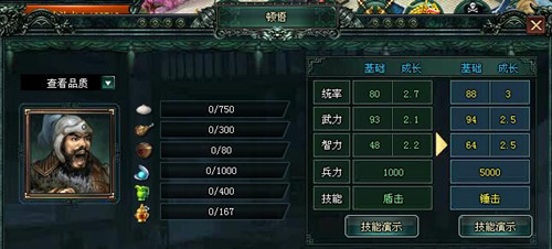 “锤击”:[普通]单体攻击,高概率眩晕目标1回合,自身恢复兵力和145士气。