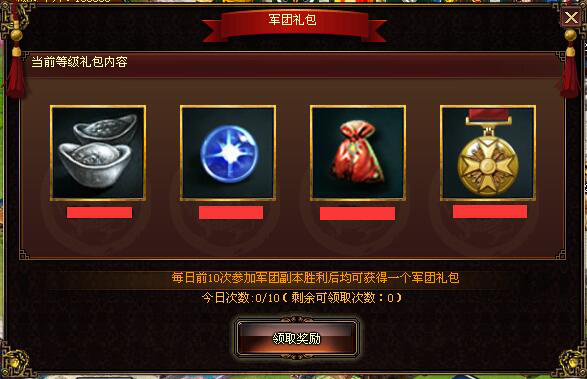 军团礼包:每个玩家每天前10次参加军团,每次都可以获得一个奖励丰富的军团礼包。