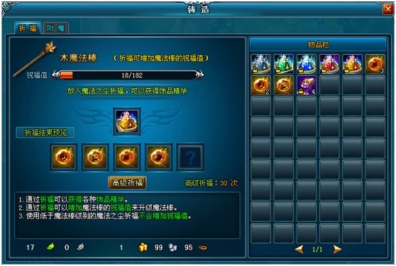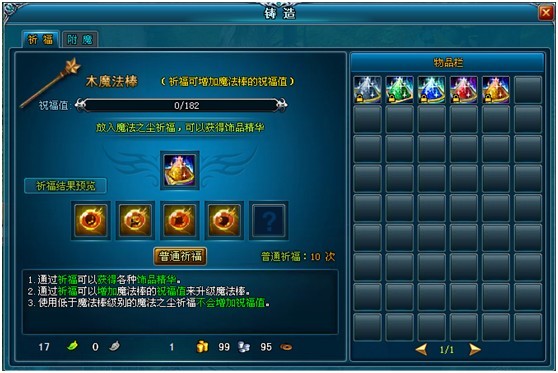 注:祈福获得的饰品精华是非绑定,其他道具为绑定;祈福获得的物品如果背包格子不足,将会通过邮件发送给玩家。