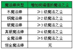 玩家可以通过【祈福】增加魔法棒的祝福值,祈福中的魔法棒共分为木魔法棒、铜魔法棒、银魔法棒、真银魔法棒、金魔法棒、恒金魔法棒。木魔法棒祝福槽满了将自动升级成铜魔法棒,以此类推;当魔法棒等级到达恒金后,祈福将不再增加祝福值。若祈福中使用的魔法之尘等级低于魔法棒等级,将不会增加祝福值。当祈福时,使用的魔法之尘等级高于魔法棒等级时,魔法棒所增加的祝福值与魔法棒自身等级有关,和魔法之尘级别无关。