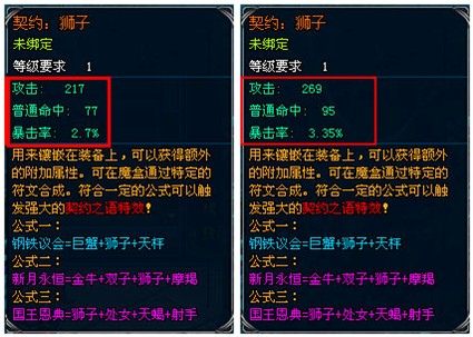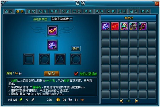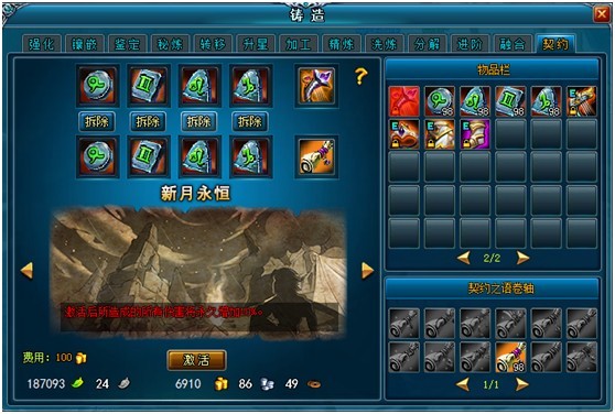3.按照公式对应匹配的凹槽镶嵌契约,被镶嵌的契约可以从装备上取出,需消耗一定金币;