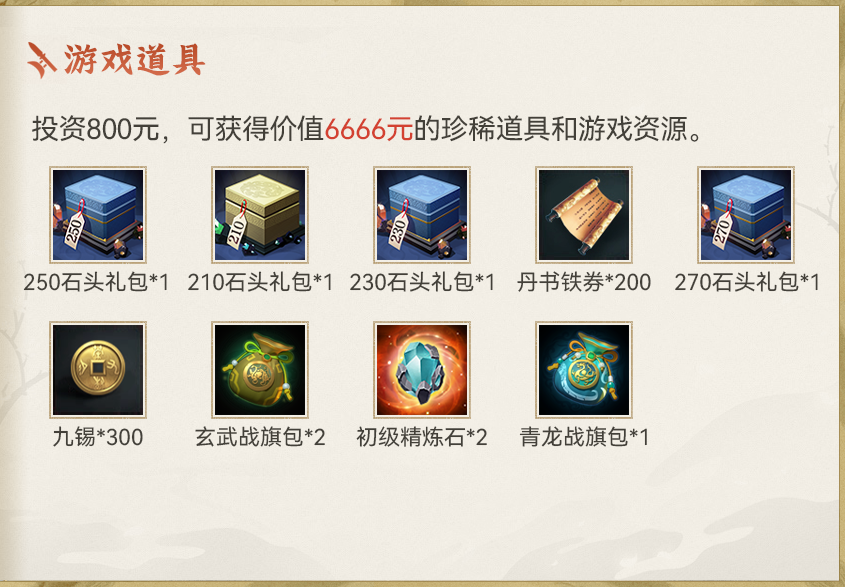 2投资800元,可获得价值6666元的道具奖励,投资后立即获得第一个道具奖励,剩余道具分8次返还(6月18日12点获得第2个道具奖励、后续每星期二12:00发放下一个道具奖励。)