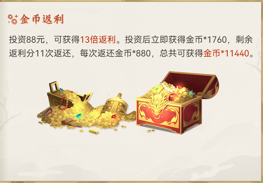 1投资88元,可获得13倍返利。投资后立即获得金币*1760,剩余返利分11次返还,每次返还金币*880。(6月18日12点获得第1次返利、后续每星期二12:00发放。)